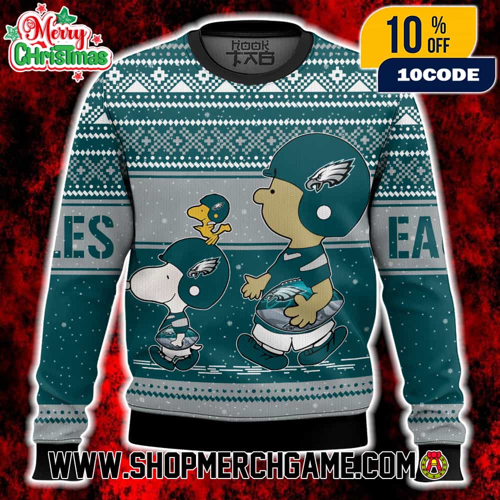 Philadelphia Eagles Snoopy Charlie Brown Ugly Christmas Sweater Peanuts NFL Football Holiday Knit With Fair Isle Pattern Snowflakes Winter Festive Gift For Fans