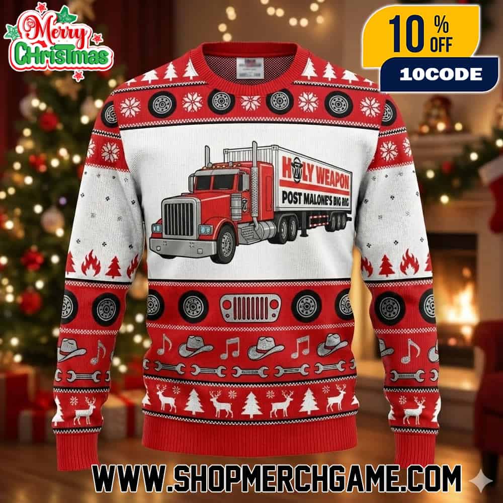 This unisex ugly Christmas sweater celebrates Post Malone’s horror graphic novel series “Big Rig,” featuring the iconic Holly Weapon semi-truck design on premium knit pullover fabric adorned with festive snowflake, reindeer, and Christmas tree patterns. The sweater showcases the red 25-ton demon-possessed delivery truck from Post Malone’s comic series published by Z2 Comics, which tells the chilling story of an Old Testament fury-powered big rig during the holiday season with the tagline “They prayed for a miracle, they got 25 tons and 18 wheels of Old Testament fury”. Post Malone, the multi-platinum recording artist and comic creator, launched Big Rig as a horror anthology series that combines his love for truck culture, horror storytelling, and holiday themes, making this sweater a unique crossover piece for fans of both his music and graphic novel work. The design features traditional ugly Christmas sweater elements including Fair Isle-style patterns with snowflakes, reindeer motifs, Christmas trees, tire wheels, music notes, and wrench graphics arranged in festive horizontal bands across red and white knit fabric, creating the perfect blend of horror comic aesthetics and holiday party wear. This collectible holiday sweater appeals to Post Malone fans, horror comic enthusiasts, truck culture admirers, and anyone seeking a conversation-starting ugly Christmas sweater that references the Grammy-nominated artist’s creative ventures beyond music. The Big Rig comic series has gained recognition in the graphic novel community since its announcement, with Post Malone serving as writer and creative force behind the possessed truck horror story, making this officially licensed merchandise a must-have for collectors of Post Malone memorabilia and fans of horror-themed Christmas apparel.