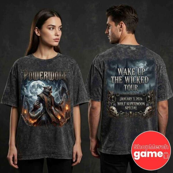 This officially licensed Powerwolf merchandise commemorates the German power metal titans’ electrifying performance during the Wake Up The Wicked Tour, specifically the Wolf Supermoon concert event held on January 3, 2026, marking a celestial alignment between the band’s iconic lupine imagery and the astronomical phenomenon of the supermoon. Powerwolf, formed in 2003 in Saarbrücken, Germany, has established themselves as one of Europe’s most theatrical and commercially successful heavy metal acts, known for their unique blend of power metal with gothic and religious themes, delivering anthemic tracks sung almost entirely in English despite their German origins. The Wake Up The Wicked Tour supports their ninth studio album of the same name, continuing the band’s tradition of exploring dark religious iconography through the lens of werewolf mythology, a concept that has defined their entire discography from “Lupus Dei” (2007) through “Call of the Wild” (2021) and beyond. This unisex acid-washed t-shirt represents a premium tour merchandise item featuring artwork specifically created for the Wolf Supermoon event, where the band’s five members—Attila Dorn (vocals), Matthew Greywolf (guitar), Charles Greywolf (bass), Falk Maria Schlegel (organ), and Roel van Helden (drums)—delivered their signature high-energy performance combining theatrical stagecraft with crushing riffs and choir-backed choruses. The January 3, 2026 date holds special significance as it coincided with the first supermoon of the year, an astronomical event where the full moon appears larger and brighter in the night sky, perfectly aligning with Powerwolf’s wolf-themed aesthetic and their devoted fanbase known as the “Wolfpack.” The acid-washed treatment of this official tour shirt provides a vintage, worn-in aesthetic that reflects both the raw power of Powerwolf’s sonic assault and the timeless nature of their heavy metal craftsmanship, making it a coveted collector’s item for fans who attended this specific tour date or wish to commemorate the band’s continued dominance in the European metal scene throughout their two-decade career of delivering relentlessly catchy, organ-driven power metal anthems.