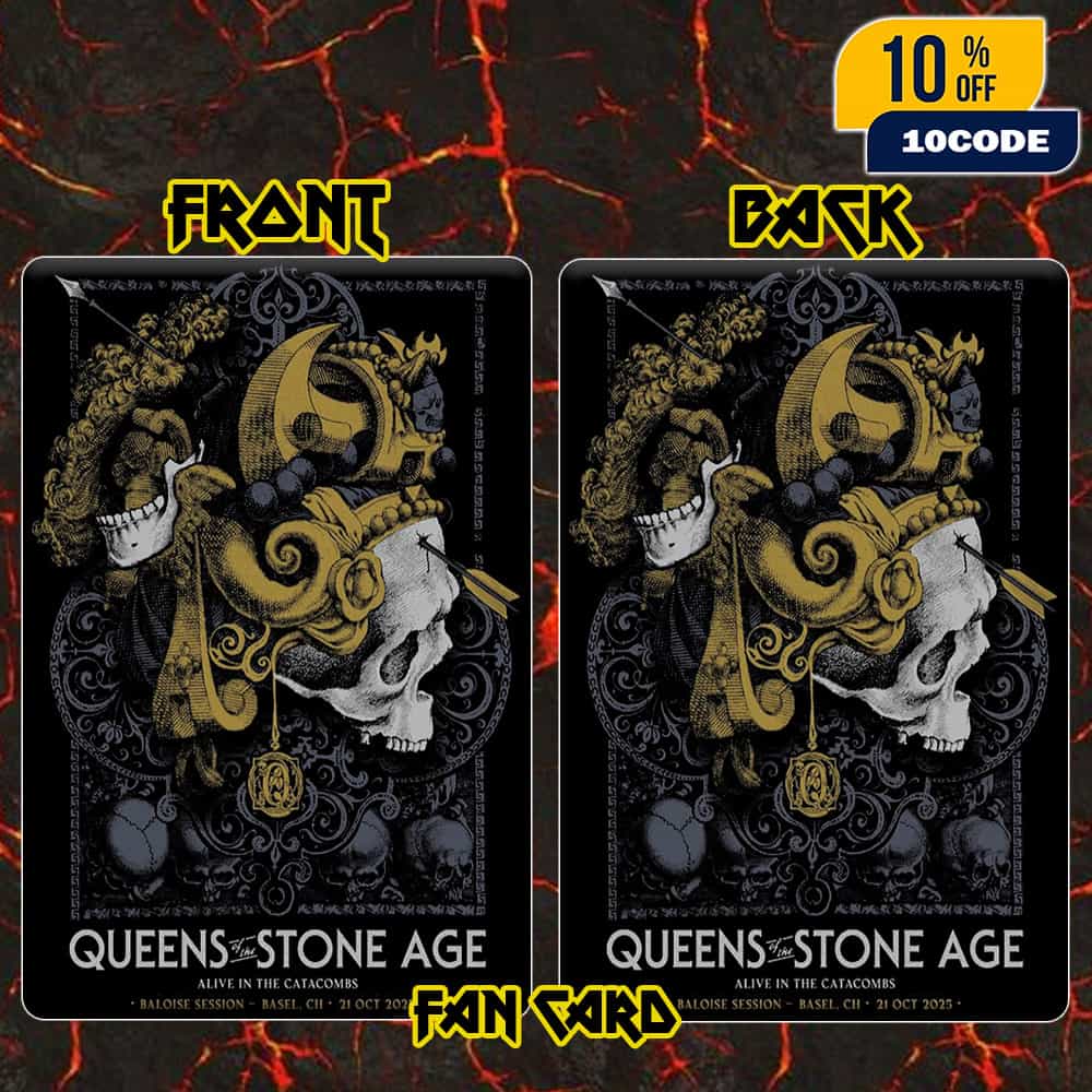 This collectible fan card commemorates Queens of the Stone Age’s exclusive performance on October 21, 2025, at the Baloise Session in Basel, Switzerland, featuring the official event artwork by renowned designer Rodolfo Jofre Saavedra as part of the band’s innovative Alive in the Catacombs Tour. The Basel concert represents one of only five European dates where Josh Homme and his legendary lineup transform their desert rock catalog into haunting acoustic arrangements inspired by their historic 2024 recording session in the Paris Catacombs, accompanied by a three-piece string section and unconventional percussion instruments. This premium fan card captures the atmospheric essence of the tour’s unique approach, which reimagines heavy rock anthems into intimate, reverb-laden performances that utilize the natural acoustics and spiritual weight of underground spaces. The Baloise Session venue, located at Messe Basel’s Congress Center, hosts Switzerland’s most prestigious music festival known for its theater-style setting and exceptional sound quality, with the QOTSA show scheduled for 8:00 PM and supported by local indie-rock band Moonpools. Following the June 2025 release of the Alive in the Catacombs EP and accompanying cinematic film, this tour brings the band’s radical acoustic reinvention to historic European theaters across Milan, Paris, Berlin, Copenhagen, Amsterdam, Antwerp, and London throughout October 2025. This compact collectible serves as an authentic keepsake for fans attending the concert or collectors seeking official tour merchandise that represents one of rock music’s most experimental and intimate live experiences, where the band strips down classics to their emotional core while maintaining the power and mystique that defines their legendary sound.