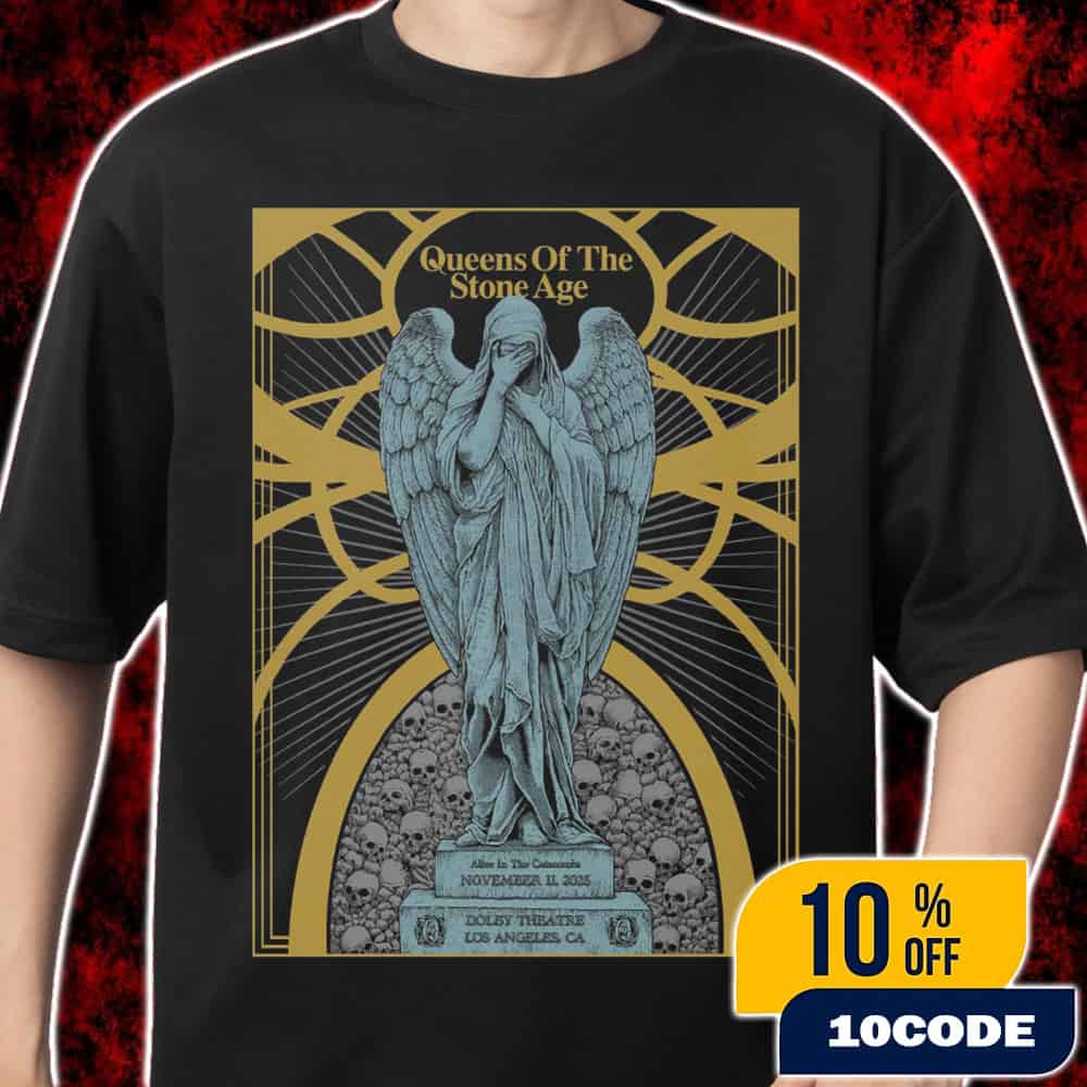 This official Queens of the Stone Age unisex t-shirt features exclusive poster event artwork commemorating the band’s highly-anticipated performance on November 11, 2025, at the iconic Dolby Theatre (6801 Hollywood Boulevard) in Hollywood, Los Angeles, California, as part of their intimate 11-date “The Catacombs Tour” supporting the groundbreaking “Alive in the Catacombs” concert film and EP recorded in the legendary Paris Catacombs in June 2025. The November 11 Los Angeles show, with doors opening at 6:30 PM and music starting at 7:00 PM, features special guest opener Paris Jackson—the American singer-songwriter daughter of Michael Jackson whose atmospheric alt-pop and indie rock style perfectly complements Queens of the Stone Age’s heavy desert rock sound, making her selection particularly fitting given the tour’s inspiration from the Paris Catacombs performance. This special theater tour showcases “all-new arrangements crafted specifically for the occasion” with enhanced assembled ensembles, moving away from traditional arena rock settings to prestigious historic theaters including Chicago Theatre, Fox Theatre Detroit, Beacon Theatre New York, and Davies Symphony Hall San Francisco, with nearly all dates selling out immediately due to the unique acoustic reimagining of QOTSA’s catalog. Queens of the Stone Age, founded by guitarist and vocalist Josh Homme in Palm Desert, California in 1996, has spent nearly three decades pushing the boundaries of rock music with their distinctive blend of heavy grooves, desert-rock riffs, and hypnotic energy across eight studio albums including Grammy-nominated works like “Songs for the Deaf” (2002), “…Like Clockwork” (2013), and their latest “In Times New Roman…” (2023), featuring breakthrough hits like “No One Knows,” “Go with the Flow,” and “Make It wit Chu”. The Catacombs Tour represents a rare opportunity to experience Queens of the Stone Age’s experimental artistic vision in one of Hollywood’s most prestigious venues—the Dolby Theatre, famous for hosting the Academy Awards—where the band’s powerful, atmospheric sound will be enhanced by theatrical arrangements that capture the haunting acoustics and intimate intensity of their underground Paris Catacombs recording session. This limited-edition merchandise celebrates a pivotal moment in Queens of the Stone Age’s 29-year career as they transform their hard-hitting rock catalog into theatrical performances that balance raw intensity with intimate artistry, making it essential collectible for fans who attended this sold-out Hollywood show or appreciate the band’s bold creative evolution during their most ambitious tour concept to date.