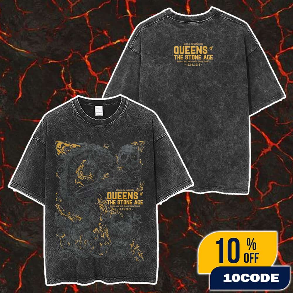This limited edition Queens Of The Stone Age Boston Event Poster On October 8 2025 commemorates the iconic American rock band’s historic performance at the Boch Center Wang Theatre during their highly acclaimed Catacombs Tour, an intimate North American theatrical tour named after their cinematic live project Alive in the Catacombs, which showcases reimagined arrangements of QOTSA’s extensive catalog spanning albums like Songs for the Deaf, …Like Clockwork, and In Times New Roman. The October 8, 2025 Boston show at the Wang Theatre—a landmark venue that first opened in 1925 as the Metropolitan Theatre, designed by architect Clarence Blackall, and stands as one of the five largest stages in America with 3,600+ seats—featured an exclusive 17-song setlist across three acts including rarities like Mosquito Song (not performed since 2007), the unreleased track Easy Street, and fan favorites Fortress, The Vampyre of Time and Memory, and Spinning in Daffodils, with doors opening at 6:30 PM and the show running from 8:30 PM to 10:20 PM. This exclusive unisex two-sided washed t-shirt features stunning limited edition artwork by renowned concert poster artist Nikita Kaun, who has created multiple official QOTSA posters including works for their Dublin 2023 and Spain 2024 shows, known for intricate screen-printed designs with limited edition numbering that have become highly collectible among fans. Queens of the Stone Age, formed in 1996 by frontman Josh Homme, has evolved from their stoner rock roots into one of the leading heavy rock bands of the 21st century, with a discography featuring eight studio albums, including their number-one Billboard 200 release …Like Clockwork, and are celebrated for their desert rock and alternative metal sound that has garnered worldwide critical acclaim and a devoted fanbase. The Catacombs Tour merchandise collection, available for limited periods through official channels, offers fans exclusive commemorative items that capture the unique theatrical essence of this special tour, which visits only curated historic venues across North America through November 2025, including Chicago Theatre, Metropolitan Opera House Philadelphia, Beacon Theatre New York, and Dolby Theatre Los Angeles. This authentic two-sided washed t-shirt serves as both a wearable piece of rock history and a collector’s item celebrating QOTSA’s groundbreaking performance at Boston’s most prestigious theater during one of their most intimate and artistically ambitious tours to date.