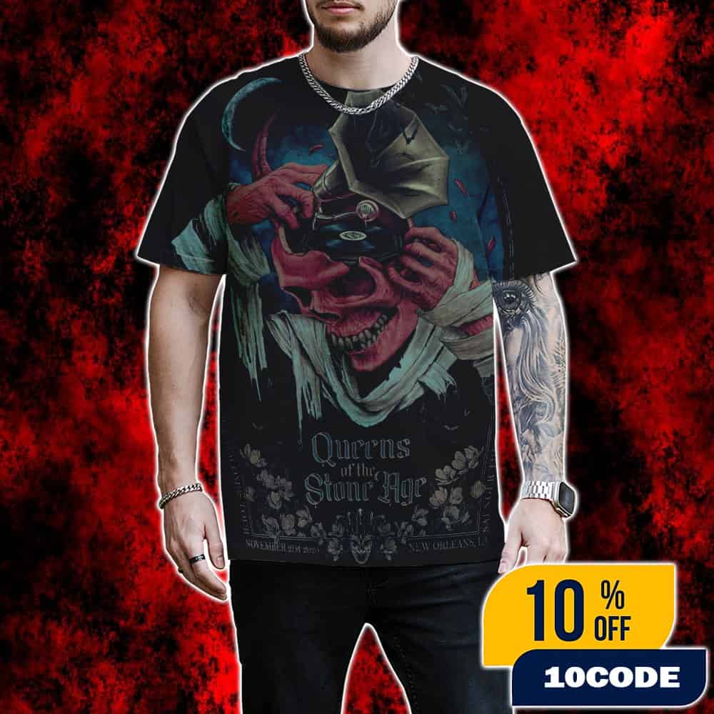 This exclusive Queens of the Stone Age all-over print graphic t-shirt and hoodie collection commemorates the desert rock legends’ November 21, 2025 performance at New Orleans’ historic Saenger Theatre as part of their critically acclaimed “The Catacombs Tour,” featuring stunning concert poster artwork by renowned designer Ryan Richardson Pratt whose gothic Victorian aesthetic with skeleton DJ imagery, ornate decorative borders, and intricate detailing creates a bold statement piece that wraps the entire garment. The New Orleans show represents a significant stop on the Catacombs Tour, where Queens of the Stone Age—led by founding member Josh Homme alongside Troy Van Leeuwen, Michael Shuman, Dean Fertita, and Jon Theodore—performed intimate venue shows with dramatically reimagined setlists featuring deeper cuts like “Running Joke / Paper Machete,” “Kalopsia,” “Villains of Circumstance,” “The Vampyre of Time and Memory,” “…Like Clockwork,” and rare performances of “Mosquito Song” and “Spinning in Daffodils” that showcase the band’s evolution from their desert rock origins to masters of introspective, haunting soundscapes. Ryan Richardson Pratt’s artwork for this New Orleans date captures the tour’s “Catacombs” theme inspired by Paris’s underground tunnels, featuring mummy-wrapped skeletal figures operating turntables against a backdrop of Victorian ornamentation, roses, and the band name spelled out in gothic lettering at the top—imagery that translates spectacularly into an all-over print design that transforms standard concert merchandise into wearable art covering the entire front, back, and sleeves of both t-shirts and hoodies. The Saenger Theatre, located at 1111 Canal Street in New Orleans’ French Quarter district with its 1927 Italian Renaissance architecture and 2,600-seat capacity, provided the perfect setting for QOTSA’s raw, intense performances that defined their 2025 touring year following appearances at Corona Capital, Rock am Ring, and across North American theaters including San Francisco’s Davies Symphony Hall and Copenhagen’s DR Koncerthuset. This limited-edition all-over print merchandise celebrates Queens of the Stone Age’s 30-year legacy since their 1996 formation, honoring a band that revolutionized alternative rock with seven studio albums including “Songs for the Deaf” (featuring Dave Grohl on drums), “Era Vulgaris,” and their Grammy-nominated masterpiece “…Like Clockwork,” while the immersive graphic design featuring Richardson’s complete poster artwork across the entire garment elevates this collection beyond standard tour merchandise, making it essential for fans who want to make a bold fashion statement celebrating the band’s theatrical live performances and the official QOTSA store’s “Alive In The Catacombs” collection aesthetic that has defined their 2025 visual identity.