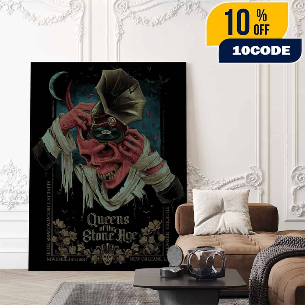 This museum-quality Queens of the Stone Age canvas poster commemorates the desert rock legends’ November 21, 2025 performance at New Orleans’ historic Saenger Theatre as part of their critically acclaimed “The Catacombs Tour,” featuring stunning concert artwork by renowned designer Ryan Richardson Pratt whose gothic Victorian aesthetic with skeleton DJ imagery, ornate decorative borders, roses, and intricate detailing transforms this limited-edition piece into gallery-worthy home decor that captures the dark, atmospheric essence of QOTSA’s theatrical live performances. The New Orleans show represents a significant stop on the Catacombs Tour, where Queens of the Stone Age—led by founding member Josh Homme alongside Troy Van Leeuwen, Michael Shuman, Dean Fertita, and Jon Theodore—performed intimate venue shows with dramatically reimagined setlists featuring deeper cuts like “Running Joke / Paper Machete,” “Kalopsia,” “Villains of Circumstance,” “The Vampyre of Time and Memory,” “…Like Clockwork,” and rare performances of “Mosquito Song” and “Spinning in Daffodils” that showcase the band’s evolution from their desert rock origins to masters of introspective, haunting soundscapes. Ryan Richardson Pratt’s artwork for this New Orleans date captures the tour’s “Catacombs” theme inspired by Paris’s underground tunnels, featuring mummy-wrapped skeletal figures operating turntables with vinyl records against a backdrop of Victorian ornamentation, the band name “QUEENS OF THE STONE AGE” spelled out in elegant gothic lettering at the top, and “A LIVE IN THE CATACOMBS TOUR” text at the bottom along with “NOVEMBER 21st 2025” and “NEW ORLEANS, LA” venue information, creating a timeless commemorative piece that celebrates both the specific concert experience and the broader artistic vision of the tour. The Saenger Theatre, located at 1111 Canal Street in New Orleans’ French Quarter district with its 1927 Italian Renaissance architecture and 2,600-seat capacity, provided the perfect setting for QOTSA’s raw, intense performances that defined their 2025 touring year following appearances at Corona Capital, Rock am Ring, and across North American theaters including San Francisco’s Davies Symphony Hall and Copenhagen’s DR Koncerthuset. Printed on premium canvas material with fade-resistant inks that preserve Richardson’s intricate details and rich color palette featuring burgundy, gold, black, and cream tones, this limited-edition poster celebrates Queens of the Stone Age’s 30-year legacy since their 1996 formation, honoring a band that revolutionized alternative rock with seven studio albums including “Songs for the Deaf” (featuring Dave Grohl on drums), “Era Vulgaris,” and their Grammy-nominated masterpiece “…Like Clockwork,” while the museum-quality canvas construction makes it an investment piece for collectors and fans who want to display their appreciation for QOTSA’s theatrical aesthetic and the official “Alive In The Catacombs” collection visual identity in their home, office, music room, or entertainment space as a conversation-starting focal point that bridges concert memorabilia with fine art.