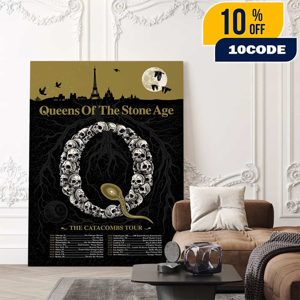 The Queens of the Stone Age The Catacombs Tour 2025 Paris Eiffel Poster Canvas Home Decor celebrates the American desert rock band’s groundbreaking Catacombs Tour, featuring their iconic October 20, 2025 performance at Le Grand Rex in Paris as part of a historic international tour spanning North America and Europe from October 2 through November 21, 2025. This officially licensed artwork by renowned design studio Morning Breath Inc—known for their collaborative poster work with Queens of the Stone Age spanning multiple album eras including Era Vulgaris—captures the atmospheric essence of the band’s transformative live show inspired by their July 2024 recording session deep within the legendary Paris Catacombs, which resulted in the “Alive in the Catacombs” EP released in June 2025. The poster showcases the complete tour dates across prestigious historic venues including Chicago Theatre, Beacon Theatre in New York City, Royal Albert Hall in London, and Davies Symphony Hall in San Francisco, with the Paris date marking a pivotal European leg stop where frontman Josh Homme and his quintet perform reimagined versions of their catalogue with string ensemble arrangements in an intimate theater setting that contrasts their traditional hard-rocking stadium performances. Perfect for collectors and fans of the Grammy-associated design team Morning Breath Inc, this premium canvas home decor piece features the distinctive darkly atmospheric visual aesthetic that mirrors the band’s exploration of mortality, reinvention, and the macabre themes central to their Catacombs project, making it an essential commemorative item for devoted followers of Queens of the Stone Age’s 30-year legacy in desert rock.
