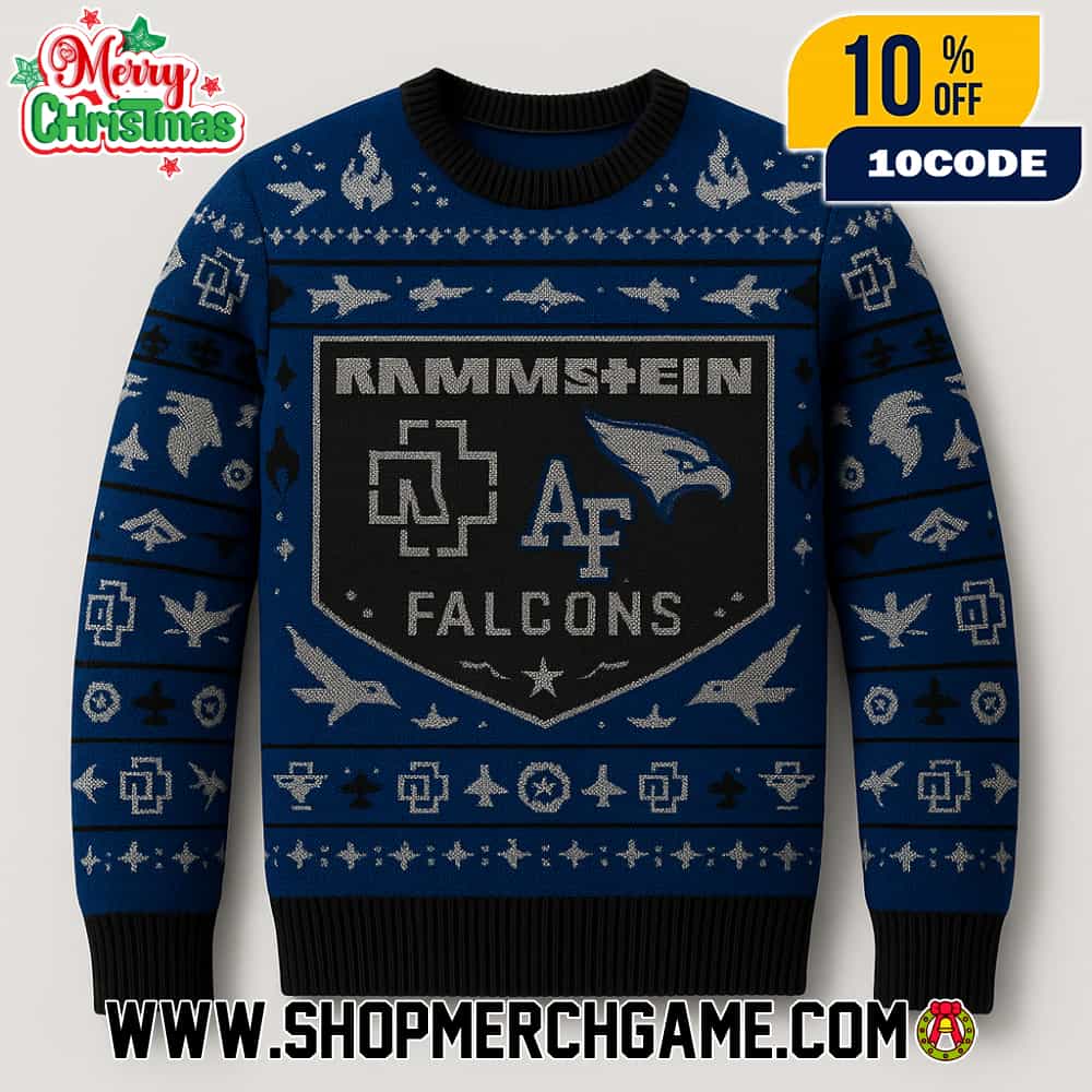 Rammstein x Air Force Academy Falcons NCAA Ugly Sweater Blue Black Knit Holiday Pullover Christmas Graphic Apparel Metal Band Unisex