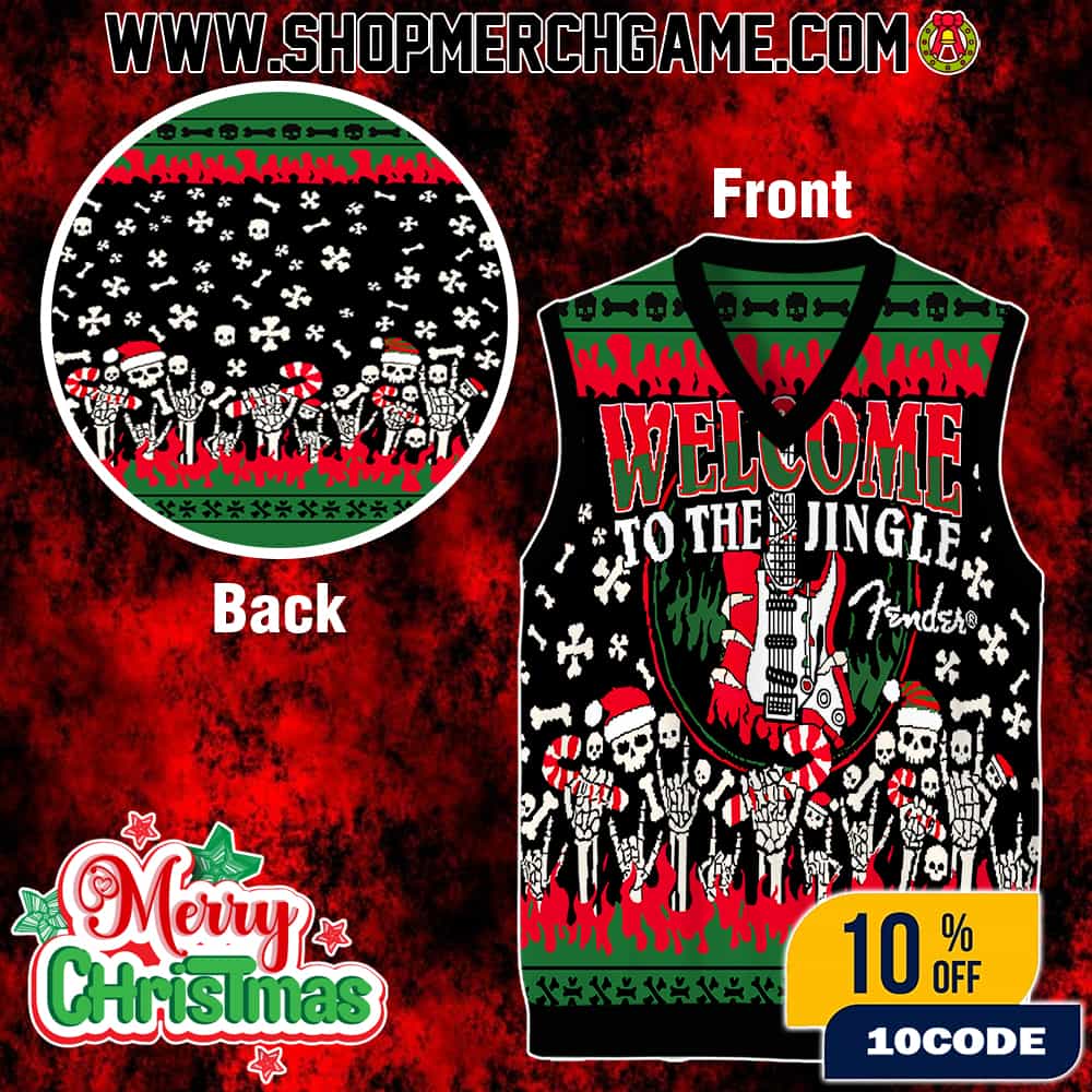 Rock N Roll Holiday Knit Vest Ugly Sweater Welcome To The Jingle Fender Christmas Skull Skeleton Guitar Heavy Metal Punk Rock Merch Gift