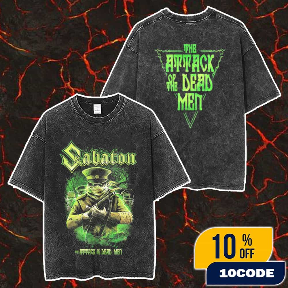 This officially licensed Sabaton Skeleton Soldier The Attack Of Dead Men t-shirt celebrates one of the most haunting tracks from the Swedish power metal band’s ninth studio album “The Great War,” released on July 19, 2019, which reached widespread critical acclaim and topped Swedish metal charts. The two-sided washed design features iconic skeleton soldier artwork inspired by the legendary historical event known as the Attack of the Dead Men at Osowiec Fortress, Poland, on August 6, 1915, when approximately 60 surviving Russian defenders launched a terrifying counterattack after enduring a devastating German chlorine and bromine gas assault, appearing bloodied and corpse-like as they coughed up blood and lung tissue yet successfully routed 12 German infantry battalions in what became one of World War I’s most gruesome defensive victories. Sabaton, founded in Falun, Sweden in 1999 by vocalist Joakim Brodén and bassist Pär Sundström, has built their reputation on addressing military history through power metal anthems without glorifying warfare but rather depicting the harsh realities and human sacrifice of historical battles. The Great War album features 11 tracks chronicling pivotal WWI events including Manfred von Richthofen, the Battle of Verdun, and Alvin York’s heroics, with “The Attack of the Dead Men” (track 4) becoming a firm fan favorite particularly electrifying during live performances, notably the March 13, 2020 Moscow show featuring Russian cover artist Radio Tapok. This premium unisex cotton t-shirt showcases front and back prints depicting the skeleton soldier motif that captures the terrifying image of the gas-ravaged Russian defenders who became known as “dead men” for their zombie-like appearance during their desperate bayonet charge that turned the tide of battle. Available through official Sabaton merchandise channels, this commemorative tour-quality garment appeals to fans of historical metal music, World War I history enthusiasts, and collectors of band memorabilia who appreciate Sabaton’s unique approach to combining epic power metal soundscapes with educational storytelling about humanity’s most significant military conflicts.