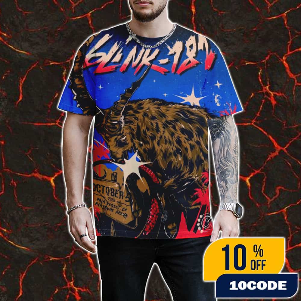 This exclusive all-over print t-shirt celebrates the electrifying second night of Blink-182’s Missionary Impossible Tour 2025 finale at Acrisure Arena in Thousand Palms, California, on October 5, 2025, featuring the official event poster artwork by acclaimed illustrator Cristian Alarcon D, which showcases a striking, serpentine design in an 8-color screen print style for a bold, immersive visual that wraps around the entire garment. As the triumphant close to the band’s 2025 North American leg—following sold-out shows from August 28 onward with the original trio of Mark Hoppus, Tom DeLonge, and Travis Barker—the concert drew a massive crowd to this state-of-the-art 11,000-seat venue in the Coachella Valley, where fans experienced a high-octane 24-song setlist heavy on punk-rock anthems like “All the Small Things,” “What’s My Age Again?,” “I Miss You,” “Adam’s Song,” and “One More Time,” alongside rarities such as “Josie,” “Online Songs,” and a Descendents cover of “Hope,” supported by special guests Alkaline Trio and Liily. Tickets for the two-night run started at around $50 for general admission, with VIP packages up to $500 including meet-and-greets and exclusive merch access, underscoring the tour’s massive demand as Blink-182 continued their post-reunion dominance after #1 hits “Edging” and “One More Time” from their 2023 album. Crafted from premium, heavyweight cotton for all-day comfort and durability, this limited-edition all-over print t-shirt—available in unisex sizing—captures the raw energy of Blink-182’s legacy as pop-punk pioneers with over 50 million albums sold worldwide, making it an essential collectible for fans reliving the chaotic, nostalgic vibes of the Missionary Impossible Tour’s unforgettable California closer.