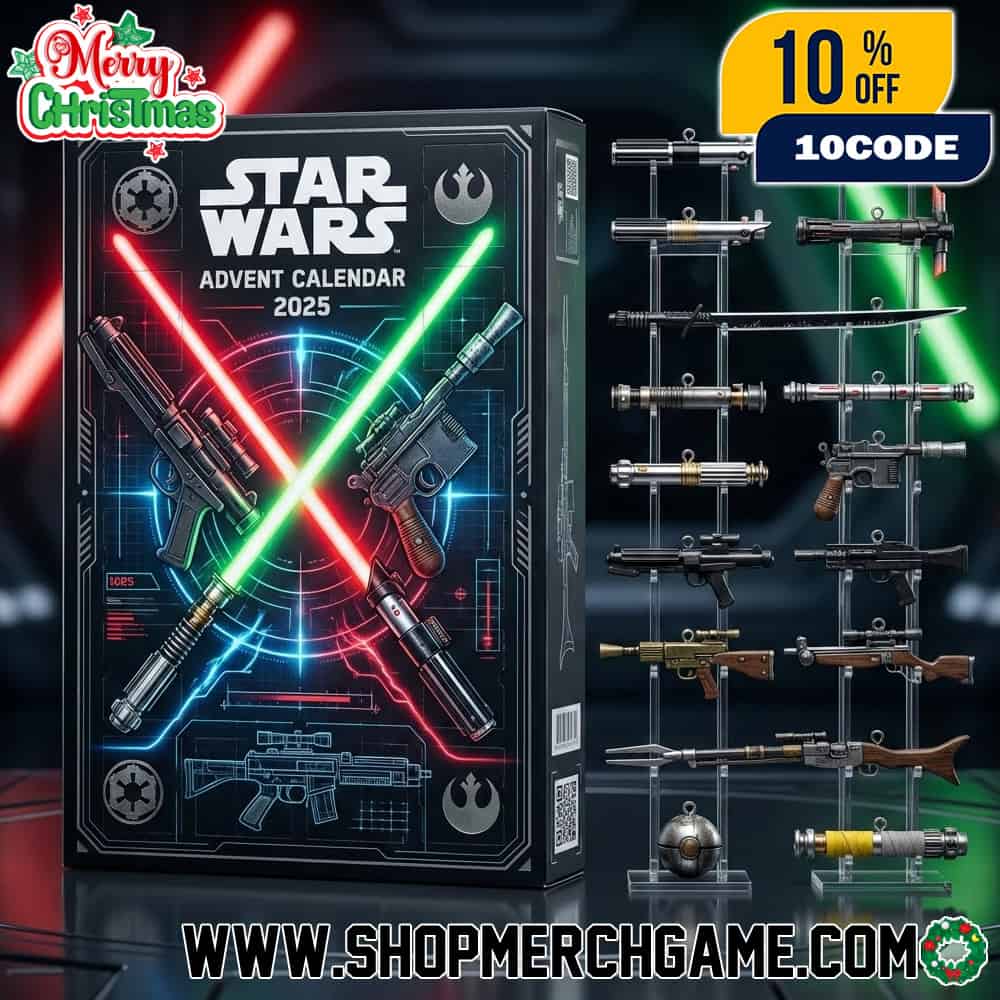 The Star Wars Advent Calendar 2025 featuring lightsaber hilts and blaster replicas with blueprint design offers weapon enthusiasts and collectors a unique 24-day countdown focused on the iconic armaments that have defined combat across the galaxy far, far away since the original 1977 film revolutionized science fiction cinema with its elegant energy weapons and futuristic blasters. This specialized advent calendar showcases miniature ornament replicas of legendary lightsaber hilts including Luke Skywalker’s green Return of the Jedi saber, Anakin Skywalker’s blue blade that became Luke’s first weapon and later Rey’s in the Sequel Trilogy, Darth Vader’s crimson Sith weapon, Obi-Wan Kenobi’s Jedi hilts from both the Prequel and Original Trilogies, Mace Windu’s unique purple-bladed saber, Count Dooku’s curved hilt, Kylo Ren’s unstable crossguard design, Ahsoka Tano’s distinctive white dual blades, Darth Maul’s double-bladed staff, Rey’s yellow-bladed lightsaber from The Rise of Skywalker, plus various Jedi Temple Guard pikes and Inquisitor spinning sabers featured in animated series and Disney+ shows. The collection also includes detailed miniature blasters representing the most recognizable firearms from Star Wars lore, such as Han Solo’s iconic DL-44 heavy blaster pistol modeled after the Mauser C96, Mandalorian warriors’ WESTAR-35 blasters, Stormtrooper E-11 rifles, Boba Fett’s EE-3 carbine, Jango Fett’s WESTAR-34 pistols, Princess Leia’s Defender sporting blaster, Chewbacca’s bowcaster crossbow weapon, Clone Trooper DC-15 rifles and pistols, plus various other weapons wielded by bounty hunters, smugglers, and military forces throughout the franchise’s extensive arsenal. Presented with technical blueprint aesthetics that echo the behind-the-scenes design documents created by Lucasfilm’s prop masters and concept artists, each ornament captures the intricate details of these weapons that represent different eras of galactic history, from the elegant weapons of the Old Republic Jedi Order to the crude yet effective armaments of the Rebellion and the advanced technology of the First Order and Resistance. This advent calendar appeals to Star Wars fans who appreciate the craftsmanship and lore behind the franchise’s weaponry, offering collectible miniatures that celebrate both the Jedi’s connection to the Force through their lightsaber crystals and fighting forms, as well as the practical combat tools used by soldiers, mercenaries, and heroes across nine episodic films, multiple animated series including The Clone Wars and Rebels, and live-action Disney+ shows like The Mandalorian, The Book of Boba Fett, Obi-Wan Kenobi, and Ahsoka that continue expanding the Star Wars universe with new weapon designs and combat styles. Perfect for display, this holiday gift allows fans to build a comprehensive collection of the galaxy’s most famous weapons throughout December, celebrating the elegant lightsaber duels choreographed by stunt coordinators like Nick Gillard and the intense blaster firefights that have thrilled audiences for nearly five decades of Star Wars storytelling.