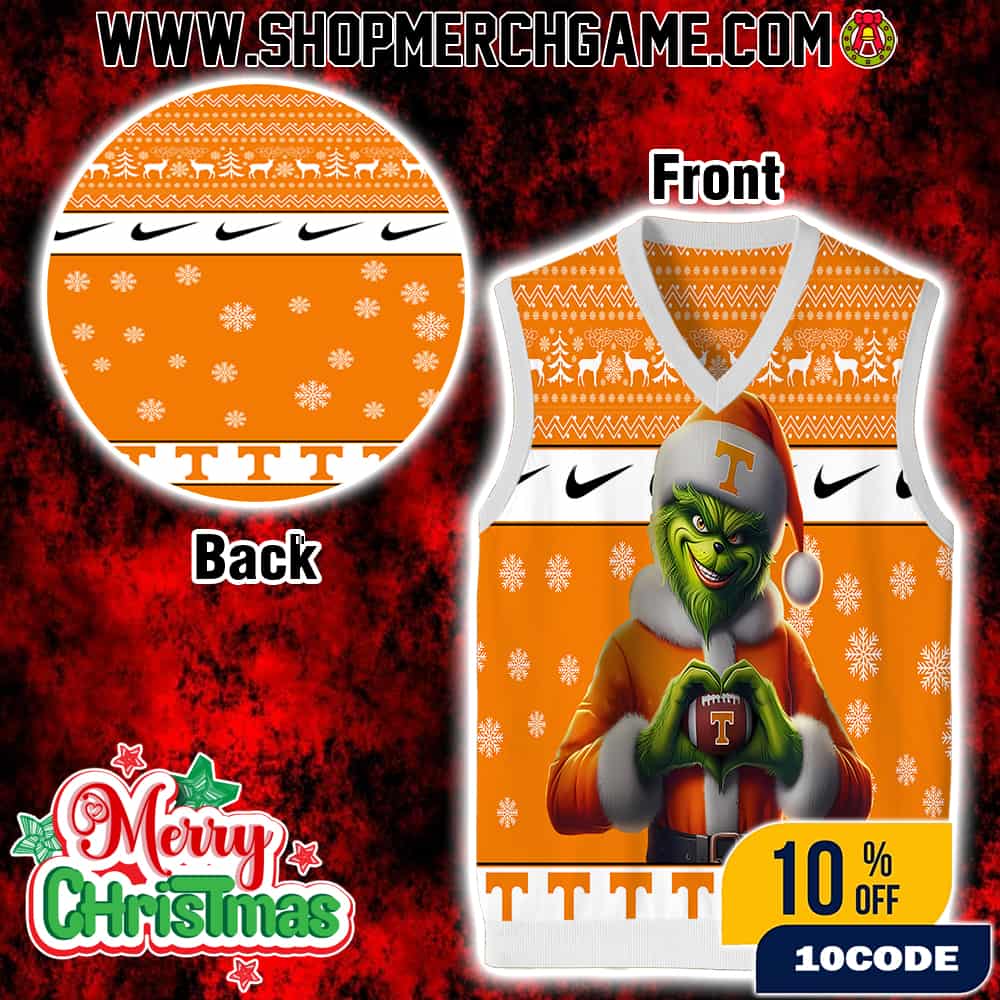 Tennessee Volunteers Grinch Ugly Christmas Sweater Gile 2025 Orange White Nike Logo Knitted Vest V Neck Fair Isle Pattern Reindeer Design Holiday Gift For UT Vols Fans Men Women