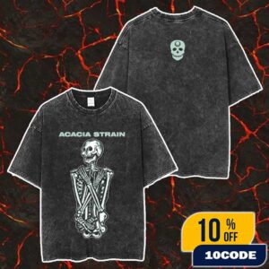 This official band merchandise celebrates The Acacia Strain’s Halloween 2025 collection featuring the clever wordplay design Acacia O Strainative, merging the Massachusetts-founded deathcore band’s name with alternative music culture. The unisex t-shirt showcases distinctive skeleton artwork rendered in white against a black shirt base, with the band name Acacia Strain displayed in signature green text across the chest, maintaining the dark aesthetic that has defined the Albany-based group since their formation in Chicopee in 2001. This seasonal release coincides with the band’s thirteenth studio album You Are Safe From God Here, which released October 24, 2025 through Rise Records, continuing their legacy of delivering bone-crushing deathcore that blends sludge, doom metal, and death metal elements. The skeleton design reflects vocalist Vincent Bennett’s longtime embrace of dark imagery and apocalyptic themes across their discography, appealing to fans who appreciate their misanthropic lyrics and humorous merchandise approach. The Acacia Strain has maintained a devoted following through relentless touring across North America and their signature triple-guitar assault sound, with previous performances at major venues from Boston to Los Angeles establishing their presence in the heavy music scene. This wearable merchandise serves multiple purposes for metalcore and deathcore enthusiasts, from concert attendance at venues nationwide to casual everyday wear, or as collectible documentation of the band’s ongoing evolution within extreme music, making it an ideal gift for fans who value authentic band merchandise that connects to The Acacia Strain’s established identity while embracing playful Halloween spirit through skeleton imagery and the creative Acacia O Strainative branding.