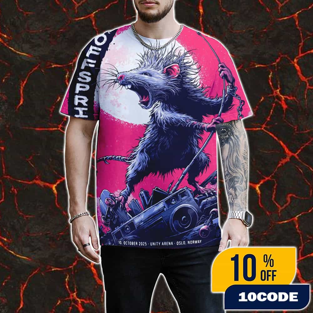 The Offspring Supercharged Worldwide In ’25 Tour Oslo Norway Event Tee represents an exclusive piece of concert memorabilia commemorating the legendary punk rock band’s electrifying performance at Unity Arena in Fornebu, Oslo, Norway on Friday, October 10, 2025, as part of their highly anticipated “Supercharged Worldwide in ’25” tour. This official event tee features striking all-over print graphic design and premium hoodie options, showcasing exclusive artwork created by renowned concert poster artist Christopher Everhart, known for his distinctive vintage-inspired illustrations and collaborations with iconic rock artists. The Oslo concert marked a significant European tour stop for The Offspring, who performed alongside special guests Simple Plan, delivering their signature high-energy punk rock setlist that included classic hits from their 40-million-record-selling discography spanning six decades since their formation in 1984. The Unity Arena show coincided with the release of the band’s explosive new album “SUPERCHARGED,” which dropped on October 11, 2024, featuring aggressive yet melodic Southern California punk rock that vocalist Dexter Holland describes as hitting “like a big punch in the face”. This limited-edition merchandise captures the raw energy of The Offspring’s reputation as one of punk rock’s most potent creative forces, alongside bands like Green Day and Rancid who revived mainstream rock interest in the 1990s. Concert-goers at the October 10th show experienced a powerful setlist featuring beloved tracks and cover songs, with doors opening at 6:00 PM and the performance starting at 7:30 PM local time. Christopher Everhart’s artwork for this Oslo event tee adds significant collector value, as his concert poster designs have become highly sought-after collectibles in the music merchandise market, known for incorporating unique cultural and regional elements into each tour-specific illustration. This authentic tour merchandise serves as a tangible memory of The Offspring’s monumental Norwegian performance and their continued legacy as one of history’s best-selling rock bands.