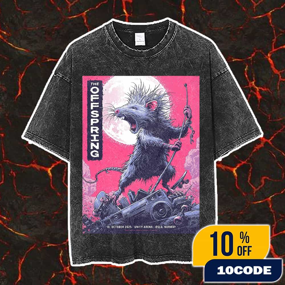 This official commemorative event t-shirt celebrates The Offspring’s electrifying performance at Unity Arena in Oslo, Norway on October 10, 2025, as part of their highly anticipated “Supercharged Worldwide in ’25” tour, featuring exclusive vintage-washed artwork by renowned concert poster artist Christopher Everhart. The legendary California punk rock band, formed in Garden Grove in 1984 and consisting of lead vocalist Dexter Holland, lead guitarist Noodles, bassist Todd Morse, drummer Brandon Pertzborn, and percussionist Jonah Nimoy, took the stage at the 15,000-capacity venue with doors opening at 6:00 PM and the show starting at 7:30 PM, joined by special guests Simple Plan for an unforgettable night of punk rock energy. The Offspring, credited alongside Green Day and Rancid for reviving mainstream rock interest in the 1990s and having sold over 40 million records worldwide, delivered a powerful performance promoting their eleventh studio album “SUPERCHARGED,” released on October 11, 2024, which frontman Dexter Holland describes as “aggressive but melodic, distinctly SoCal, but still for everyone,” inspired by the visceral sounds of AC/DC and Operation Ivy. Christopher Everhart, known professionally as The Silent Giants, is a celebrated Detroit-based concert poster artist whose distinctive vintage-inspired illustration style has created exclusive artwork for legendary acts including Jack White, The Who, Sturgill Simpson, and The Offspring’s 2025 European tour dates, making this limited-edition merch piece a highly collectible item for fans and poster art enthusiasts. This unisex vintage washed t-shirt captures the essence of The Offspring’s six-decade legacy of high-energy performances and chart-topping punk anthems like “Come Out and Play,” “Self Esteem,” and “The Kids Aren’t Alright,” serving as the perfect memorabilia for attendees of the Unity Arena show or collectors who want to commemorate the band’s triumphant return to Scandinavia as one of punk rock’s most potent creative forces. Official tour merchandise from The Offspring’s store typically ranges from $40-$45 for standard tour tees, with this special event edition featuring Everhart’s exclusive Oslo-specific artwork representing a premium collectible piece from the band’s 2025 world tour campaign.