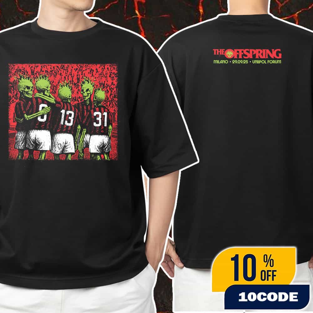 This The Offspring Supercharged Worldwide In ’25 Tour Poster Event September 29 2025 At Milano Unipol Forum unisex t-shirt commemorates the legendary American punk rock band’s triumphant performance on September 29, 2025, at 9:25 PM at the Unipol Forum (also known as Mediolanum Forum) in Assago, Milano, Italy, featuring special opening act Simple Plan as part of their global SUPERCHARGED Worldwide in ’25 tour supporting their eleventh studio album “SUPERCHARGED,” released October 11, 2024, via Concord Records. The exclusive artwork by C. Everhart features a stunning tribute design inspired by AC Milan’s legendary 1992-93 Scudetto-winning season, depicting five green skeleton figures wearing the iconic red-and-black “Rossoneri” jerseys with numbers 13, 13, and 31, celebrating Milan’s historic 13th Serie A championship achieved under manager Fabio Capello with an unprecedented 58-match unbeaten streak from 1991 to 1993, featuring football legends Marco van Basten, Jean-Pierre Papin, Ruud Gullit, Frank Rijkaard, Paolo Maldini, Franco Baresi, and Zvonimir Boban in what remains one of the greatest achievements in Italian football history. This limited edition merchandise celebrates The Offspring’s incredible 41-year career since their formation in Garden Grove, California in 1984 (originally as Manic Subsidal), led by founding members Bryan “Dexter” Holland (lead vocals, rhythm guitar) and Kevin “Noodles” Wasserman (lead guitar), alongside Todd Morse (bass), Jonah Nimoy (multi-instrumentalist), and Brandon Pertzborn (drums), who have sold over 45 million records worldwide making them one of the best-selling punk rock bands of all time. The concert t-shirt honors the band’s latest album “SUPERCHARGED,” produced and mixed by legendary producer Bob Rock, recorded across three locations in Maui, Vancouver, and Huntington Beach, featuring 10 tracks totaling 32 minutes of pure punk rock energy including singles “Looking Out For #1,” “Light It Up,” “Come to Brazil,” “Make It All Right,” and “Ok, But This Is The Last Time,” with critics praising it as an improvement over their 2021 album “Let the Bad Times Roll”. This unisex merchandise design perfectly blends Italian football heritage with Southern California punk rock culture, honoring both AC Milan’s unbeaten 1992-93 campaign (which included dramatic victories like the 5-4 away win at Pescara, 7-3 triumph at Fiorentina, and 5-3 home win against Lazio) and The Offspring’s legendary status as one of the bands that revived mainstream punk rock in the 1990s alongside Green Day, NOFX, Bad Religion, and Rancid. The t-shirt celebrates The Offspring’s iconic discography including their breakthrough album “Smash” (1994), which holds the world record for most sales of an album on an independent label with over 11 million copies sold, plus classic albums “Americana” (1998), “Conspiracy of One” (2000), and “Rise and Fall, Rage and Grace” (2008), featuring timeless hits like “Come Out and Play,” “Self Esteem,” “The Kids Aren’t Alright,” “Pretty Fly (For a White Guy),” “Original Prankster,” and “You’re Gonna Go Far, Kid”. This official tour merchandise makes the perfect collector’s item for fans who attended the Milan show or appreciate the unique artistic collaboration between punk rock legend Dexter Holland (who remarkably earned his Ph.D. in molecular biology from USC in 2017 while touring with The Offspring) and Italian football history, combining two cultural icons in one striking wearable art piece that captures the energy and passion of both rock music and calcio.