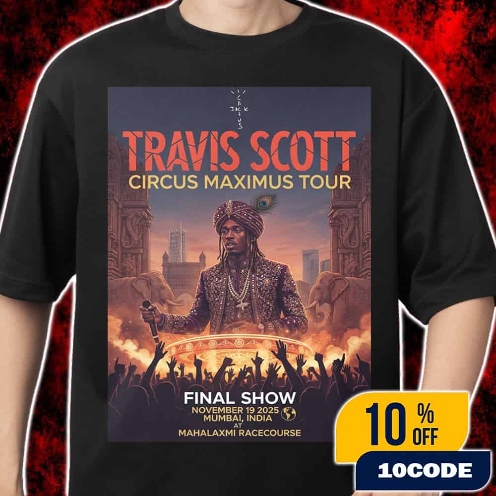 The Travis Scott Circus Maximus Tour Final Show November 19 2025 Mumbai India Mahalaxmi Racecourse Concert Poster Indian Maharaja Royal Design Merch Unisex T-Shirt commemorates the historic closing night of the highest-grossing rap tour of all time—Travis Scott’s record-breaking Circus Maximus World Tour with $209.3 million in revenue—as the Houston hip-hop icon brings his explosive live experience to Mumbai’s iconic Mahalaxmi Race Course Polo Ground on Wednesday, November 19, 2025, at 5:00 PM, marking his second and final performance in India following two sold-out shows in Delhi at Jawaharlal Nehru Stadium in October 2025. This limited-edition concert merchandise unisex t-shirt features stunning Indian Maharaja royal design artwork that pays homage to India’s rich cultural heritage while capturing the grandeur of Travis Scott’s visit to the subcontinent, with ornate golden details, elephant imagery, peacock feathers, and regal palace motifs that blend American hip-hop aesthetics with traditional Indian artistry, creating a unique visual celebration available exclusively at the venue merchandise booths on concert day. Ticket prices for the Mumbai finale ranged from ₹15,000 for Gold Platform and ₹16,000 for Fan Pit Grounds Left/Right to ₹35,000 for Premium Lounge Seated sections in Blocks A/B/C/D/E, with VIP Nation upgrade packages offering early entry into Silver Ground sections, exclusive VIP laminates, limited merchandise items, and designated check-in with on-site VIP staff for fans seeking enhanced concert experiences. The show features Travis Scott’s signature rollercoaster-themed stage production with massive pyrotechnics, flames, towering visuals, lasers slicing through the air, synchronized LED walls, and crowd interaction zones that transform the Utopia album’s dystopian themes into an immersive sensory overload featuring career-spanning hits including “FE!N” (performed multiple times), “SICKO MODE,” “goosebumps,” “Antidote,” “HIGHEST IN THE ROOM,” “I KNOW?,” “MY EYES,” “THANK GOD,” “Stargazing,” and “Butterfly Effect”. Official Circus Maximus India Tour merchandise is available exclusively through CircusMaximus.in and on-site at Mahalaxmi Racecourse, with pricing ranging from Rs. 1,849 for standard tees to Rs. 4,945 for premium items like the CJ x FC Barcelona Retro Zip Anthem Jacket, including collections from Utopia, Astroworld, Rodeo 10 Years Anniversary, Jackboys II, and collaborations with brands like Nike, McDonald’s, WWE, Oakley, and AP. This collectible concert t-shirt captures the essence of Travis Scott’s monumental impact on global hip-hop culture and his groundbreaking entry into the Indian market, where his three shows attracted over 180,000 fans combined despite ticket prices ranging from ₹6,500 to ₹35,000 selling out within hours on BookMyShow, demonstrating the massive appetite for international hip-hop in South Asia’s fastest-growing live music market. The Indian Maharaja royal design serves as wearable memorabilia for fans who witnessed or supported the historic moment when Travis Scott—a visionary hitmaker, cultural icon, and one of the most electrifying performers of our time—brought his high-octane energy, atmospheric soundscapes, and “Rage Nation” philosophy to India for the first time, setting a new benchmark for live music experiences in the country while closing out the most successful rap tour in history.