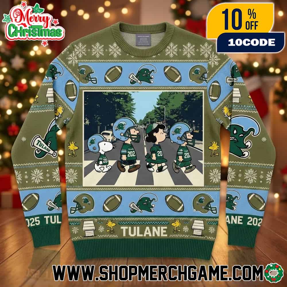 Tulane Green Wave 2025 Ugly Christmas Sweater Peanuts Abbey Road Football Knit Holiday Pullover With Snoopy Lucy And Tulane Logo Helmets