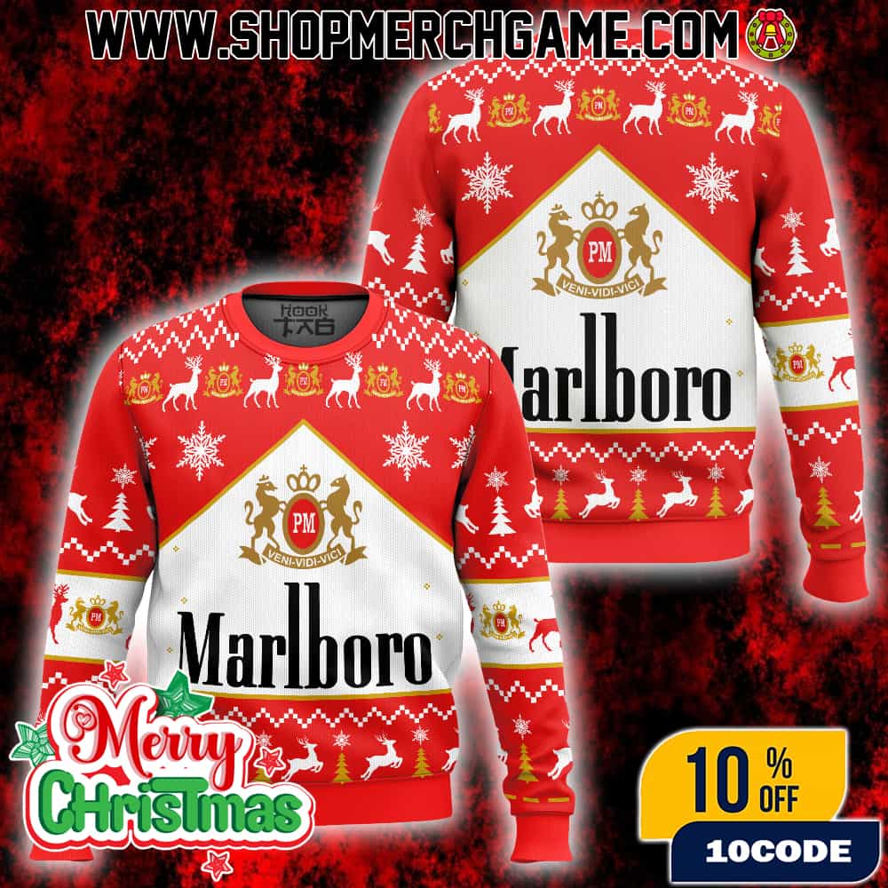 This unique holiday knitted pullover represents a fascinating intersection of tobacco heritage and contemporary festive fashion, featuring the iconic Marlboro cigarette design with authentic Philip Morris Crown logo elements in a traditional Fair Isle pattern. Marlboro, established in 1924 by Philip Morris as “America’s luxury cigarette,” evolved from a women’s brand marketed as “Mild As May” to the globally recognized symbol of rugged masculinity through the legendary Marlboro Man campaign launched in the 1950s. The Philip Morris Crown logo, originating from the company’s 1885 heraldic design featuring regal lions flanking a crowned shield with the Latin motto “VENI, VIDI, VICI,” represents centuries of tobacco craftsmanship and heritage. This festive sweater cleverly incorporates these historical branding elements into the beloved ugly Christmas sweater tradition, which emerged from 1950s “Jingle Bell Sweaters” and gained cultural prominence through the 1980s excess era of glitter and sequins before becoming an ironic holiday celebration in the 2000s. The Fair Isle knitting pattern, combined with Christmas tree motifs, creates a nostalgic winter apparel piece that appeals to smoking enthusiasts who appreciate tobacco industry history and vintage advertising aesthetics. Perfect for ugly sweater parties held every third Friday of December during National Ugly Christmas Sweater Day, this distinctive pullover serves as both a conversation starter and a tribute to one of the most recognizable brand identities in commercial history. The design successfully merges Philip Morris’s Victorian-era sophistication with modern holiday humor, making it an ideal gift for collectors of tobacco memorabilia or anyone who appreciates the cultural significance of advertising iconography in fashion.
