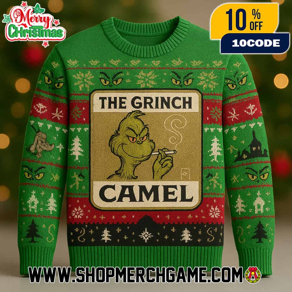 This Ugly Sweater The Grinch x Camel Smoking Parody Design Christmas Knit combines the iconic green grump from Dr. Seuss’s beloved 1957 children’s story “How the Grinch Stole Christmas!” with a humorous Camel cigarette parody motif, creating a bold and irreverent holiday jumper perfect for festive gatherings in 2025. The Grinch character, who lives atop Mount Crumpit overlooking Whoville and famously attempted to steal Christmas from the cheerful Whos before his heart grew “three sizes,” has become a timeless symbol of holiday redemption since the story’s publication and was immortalized in the 2000 Jim Carrey film that earned over $345 million worldwide. This green Fair Isle Nordic pattern sweater features authentic Scandinavian-inspired knitting techniques with traditional motifs including reindeer, snowflakes, and Christmas trees woven throughout the design, representing the intermediate-level craftsmanship that has made Fair Isle patterns a staple of holiday knitwear since their origins in Nordic culture. The timing is particularly relevant as Universal Pictures celebrates the 25th anniversary of “How the Grinch Stole Christmas” with a theatrical re-release on December 12, 2025, while Grinch merchandise continues to dominate retail stores from Primark to specialty shops worldwide. The ugly Christmas sweater trend, which reached peak popularity around 2012 and continues to thrive through 2025, embraces deliberately garish designs featuring bold colors, 3D embellishments, and pop culture mashups, making this Grinch-Camel parody piece an authentic example of the genre’s humorous, anti-fashion aesthetic. The green color palette directly references the Grinch’s distinctive appearance while the Fair Isle Nordic knitting pattern with holiday motifs provides the traditional “ugly sweater” foundation that has become essential to Christmas parties, office gatherings, and charity events like the UK’s Christmas Jumper Day. This jumper serves both as wearable fan merchandise for devotees of Dr. Seuss’s classic character and as a conversation-starting statement piece that satirizes both commercial holiday traditions and vintage cigarette advertising through its cheeky crossover design.