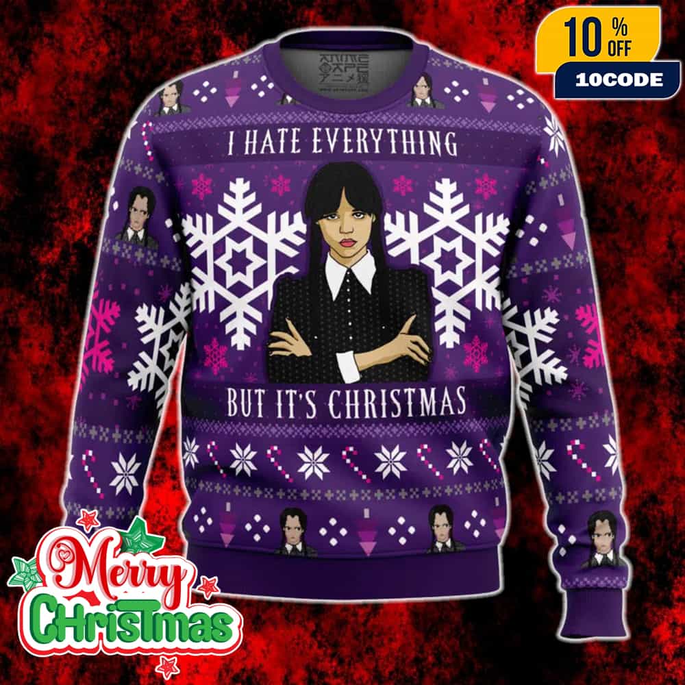 This Wednesday Addams Ugly Christmas Sweater I Hate Everything Funny Gothic Holiday Pullover celebrates the iconic character from Netflix’s hit supernatural series Wednesday, starring Jenna Ortega as the darkly witty and psychic teenager attending Nevermore Academy. Wednesday Addams, known for her signature all-black aesthetic, deadpan humor, and misanthropic personality, has become a cultural phenomenon since the Tim Burton-produced series debuted, spawning extensive merchandise collections that embrace her gothic and macabre style. This festive pullover perfectly captures Wednesday’s infamous cynicism with the hilariously relatable phrase “I Hate Everything,” reflecting her characteristic disdain for cheerfulness and social conventions that fans have come to adore throughout both seasons of the Netflix series. The ugly Christmas sweater trend, which experienced a nostalgic resurgence in the 2000s as an ironic nod to the bold, kitschy designs of the 1980s and 1990s, has evolved into a mainstream holiday tradition celebrated annually on the third Friday of December at parties, office gatherings, and family celebrations worldwide. This particular design merges two beloved cultural phenomena by combining Wednesday’s dark, gothic aesthetic with the deliberately garish and humorous nature of ugly Christmas sweaters, creating a unique holiday garment that appeals to fans of alternative fashion, Netflix’s supernatural drama series, and anyone who appreciates irreverent holiday humor. The pullover features gothic-inspired design elements reminiscent of Wednesday’s Victorian-era influenced wardrobe and the moody, romantic aesthetic showcased throughout the series, making it an ideal conversation starter for holiday gatherings where standing out with personality-driven fashion is encouraged. Perfect for fans of The Addams Family franchise, alternative fashion enthusiasts, and anyone who relates to Wednesday’s sardonic worldview, this sweater offers a comfortable and stylish way to celebrate the holidays while maintaining an edgy, countercultural attitude that rejects traditional festive cheer in favor of darkly comedic self-expression.