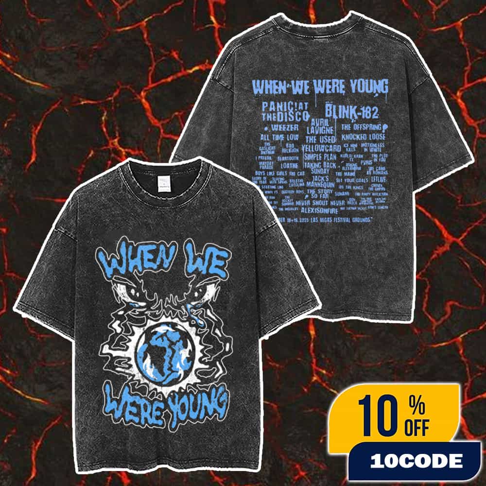 The When We Were Young Festival on October 18-19, 2025 at Las Vegas Festival Grounds, presented by 7-Eleven, stands as one of the most anticipated emo, pop-punk, and alternative rock music celebrations of the year, drawing tens of thousands of fans to Nevada for a weekend of pure nostalgia. This official festival merchandise unisex two-sided washed t-shirt commemorates the epic lineup featuring over 50 legendary bands across four stages including headliners Panic! At The Disco reuniting to perform their iconic 2005 debut album “A Fever You Can’t Sweat Out” in its entirety, and blink-182 celebrating their classic albums “Enema of the State” (1999), “Take Off Your Pants and Jacket” (2001), and their self-titled 2003 record. The festival’s stellar lineup also includes Weezer, Avril Lavigne, The Offspring, All Time Low, The Used, Knocked Loose, The Gaslight Anthem, Bad Religion, Yellowcard, Ice Nine Kills, Motionless In White, I Prevail, Beartooth, Simple Plan, Taking Back Sunday, Mayday Parade, Alexisonfire, and many more genre-defining artists spanning multiple generations of alternative music. This two-sided washed t-shirt features authentic festival branding with the overseer lineup details, offering fans a premium vintage-style garment that captures the essence of this massive two-day event that runs from 11:00 AM with performances continuing through late-night sets on the 7-Eleven, Pink Stage, Ghost, and Allianz stages. General admission tickets for the festival include access to all-day performances on multiple stages, regional and local food vendors, bars, concessions, official band merchandise, festival merchandise, and free water stations, with GA+ upgrades offering exclusive lounge access, air-conditioned restrooms, and dedicated entry lanes. The festival, which found its permanent home at the Las Vegas Festival Grounds in 2022 after starting in Santa Ana, California in 2017, has become the ultimate destination for fans of the golden era of emo and pop-punk music, selling out quickly each year and expanding to accommodate overwhelming demand. This official merch item serves as a tangible memory of an unforgettable weekend celebrating the bands and music that defined a generation, making it an essential collectible for attendees and fans of the alternative rock scene.